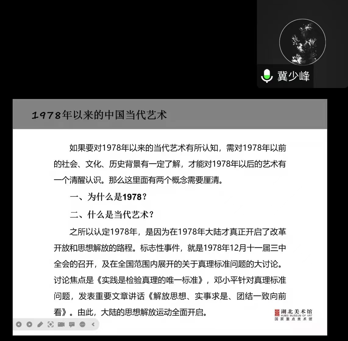 11月24日下午,湖北美术馆馆长冀少峰应公司邀请,在线做了题为“1978年以来的中国当代艺术”的学术讲座,讲座由公司经理聂书法主持,近300余名师生参加。
